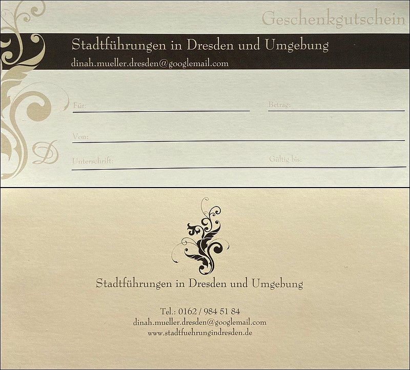 Als Gutschein in gewünschter Höhe ab 35 Euro (brutto). Einsetzbar für das Honorar bei jeder angebotenen Führung.